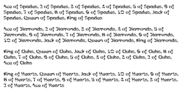 Now take any shuffled deck of cards and deal them face up one at a time. Don’t try to memorize the order, just watch the cards go by and name each card out loud. Repeat, but this time do every other card or even larger blocks of cards at once. Repeat once or twice more looking at fewer cards in the stack. The above font, combined with the gradual immersion technique should allow you to memorize a shuffled deck of cards in a remarkably short amount of time – with almost no effort.